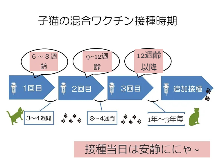 以下の表は子猫から成猫になるまでのワクチンの流れを乗せたものです。