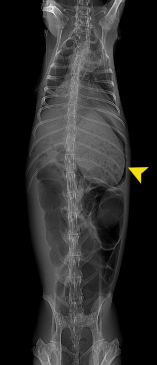 胃の中に大きな毛球と思われる異物(矢印)がみられます。